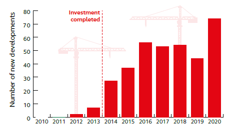 At Burnley Manchester Road station, which previously was burdened with inadequate facilities and poor connectivity, the station investment has transformed the local area. Planning data has shown that two years prior to the delivery of the improvements there were only three new developments within a one-mile radius of the station, but as shown in the chart below, in the years since the investment was completed this has risen markedly to almost 80 annual projects, underpinning once again that stations can be real placemakers in the communities and economies they serve.